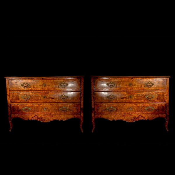 Pareja de cómodas italianas del siglo XVIII, de líneas sinuosas decoradas con marquetería geométrica, que resalta el veteado del nogal. Con tres amplios cajones adornados con manerales de bronce en motivos florales, las cómodas evocan la elegancia del estilo Luis XV. Estas piezas son ejemplos de la refinada ebanistería italiana, reflejando el lujo y la sofisticación de los interiores aristocráticos de la época.