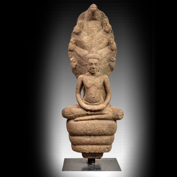 Monumental Grande Buda Mucilinda, sentado en meditación sobre el cuerpo del naga, desplegando su capucha septacéfala para protegerse de la inundación. Su rostro sereno, con una sonrisa típicamente jemer, expresa profunda meditación. Su peinado, una fina trenza rematada por la protuberancia craneal ushnisha. Arenisca beige. Camboya. La espalda del naga está finamente tallada con un chakra, símbolo de la ley budista, el atributo del disco del dios Visnú, siendo Buda el noveno avatar de Visnú. Camboya. Jemer. Yacimiento de Bayon. Siglo XIII. 110 x 22 x 45 cm
