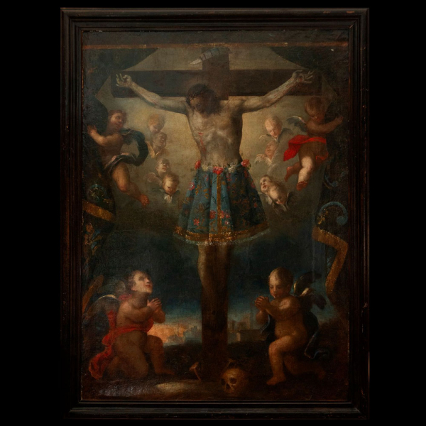 Esta monumental pintura representa al Santo Cristo de La Grita, imagen venerada del Virreinato de Nueva Granada, inspirada en la escultura realizada por fray Francisco tras el terremoto de 1610. Cristo crucificado aparece con los brazos extendidos y el cuerpo cubierto por un paño azul decorado con motivos florales dorados, cuya riqueza textil contrasta con la desnudez del torso lacerado. Alrededor, un grupo de ángeles despliega una intensa teatralidad barroca, destacando por sus expresiones compungidas y sus gestos de plegaria. El uso del claroscuro y los efectos lumínicos en el fondo refuerzan la atmósfera de trascendencia mística. La factura evidencia una pincelada suelta en las carnaciones y un esmerado trabajo en las vestiduras y detalles iconográficos. Esta pieza constituye un importante testimonio devocional de la religiosidad andina-colonial y su capacidad para fusionar la tradición barroca europea con elementos locales.