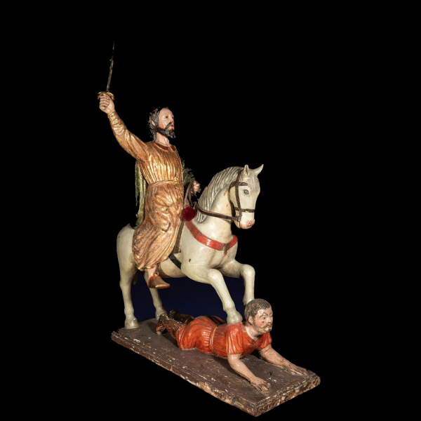 Medidas: 150 x 95 x 33 cm, medida alto sin espada: 110 cm. Excelente estado de conservación en policromía dada antigüedad.