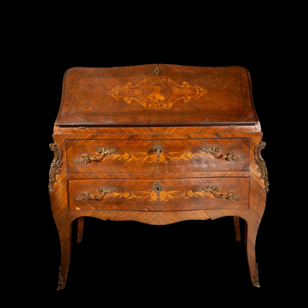 Dimensiones: 106 × 102 × 48 cm. Madera de nogal con manerales de bronce. Secreter estilo Regencia del siglo XVIII, adornado con marquetería floral y vegetal de gran detalle. La tapa abatible revela compartimentos secretos y una disposición interior destinada al almacenamiento de documentos. El contraste entre el nogal y los detalles en bronce realza la nobleza del mueble, que exhibe un equilibrio entre funcionalidad y belleza ornamental. El estilo Regencia, con su sobriedad decorativa y líneas elegantes, se aprecia en cada detalle de esta obra maestra de ebanistería europea.