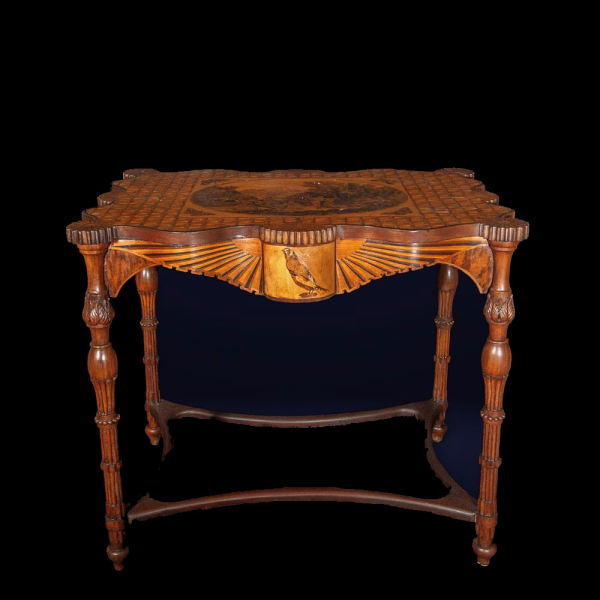 Laterales evocando las alas de aves en marquetería de diferentes maderas nobles y tapa central ricamente ornados con motivos de Mariposas y pastores alpinos. Buen estado, medidas: 72 x 81 x 53 cm