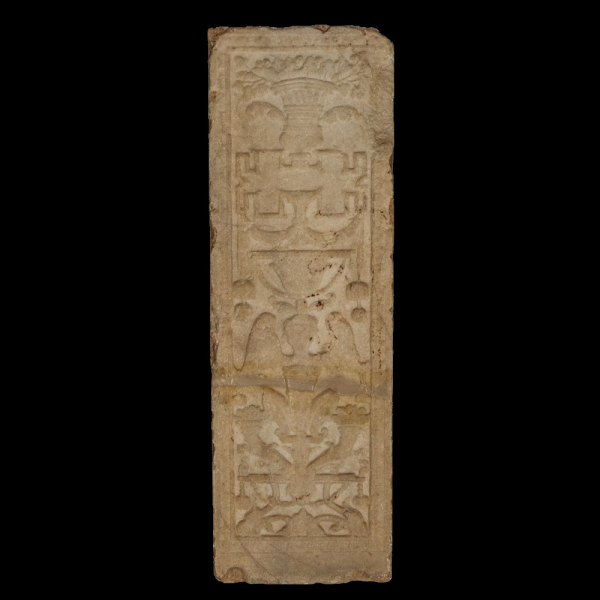 La superficie muestra elementos arquitectónicos y simbólicos claramente organizados en registros verticales, destacando motivos como escudos, coronas, figuras zoomorfas estilizadas y vegetación esquemática. La talla presenta un notable refinamiento técnico en la definición de los contornos y la modulación de planos, a pesar del desgaste propio del tiempo. El mármol, de tonalidad clara, revela vetas naturales que enriquecen visualmente el conjunto. Este friso, de probable procedencia romana, corresponde a la estética renacentista del Cinquecento, en la que se recuperaron modelos clásicos reinterpretados con fines decorativos y simbólicos, propios de la arquitectura palaciega o eclesiástica del periodo. 59 x 19 x 6 cm.