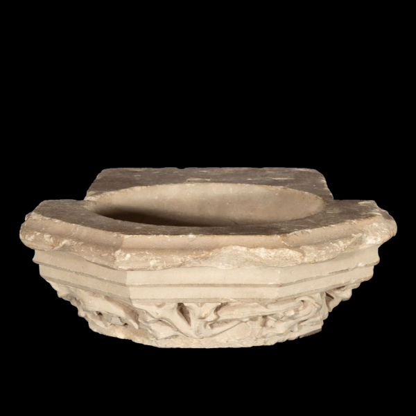 11 x 34 x 38 cm. En piedra mármol. Pila octogonal, con decoración en relieve de carácter vegetal y geométrico en la zona inferior del cuerpo. La pieza presenta un recipiente profundo y amplio en la parte superior, pensado para contener agua bendita, y una estructura de base escalonada que permite su estabilidad. La labra, aunque erosionada, conserva trazos estilizados de zarcillos, hojas y nervaduras propios del repertorio gótico tardío. El mármol, de superficie rugosa y bordes irregulares, enfatiza la antigüedad y autenticidad de la obra. Este tipo de pilas, asociadas a usos litúrgicos en parroquias o ermitas, refleja el lenguaje simbólico y espiritual de la Baja Edad Media, donde el arte gótico buscaba elevar la experiencia religiosa mediante formas ascéticas y decoración simbólica. 11 x 34 x 38 cm.