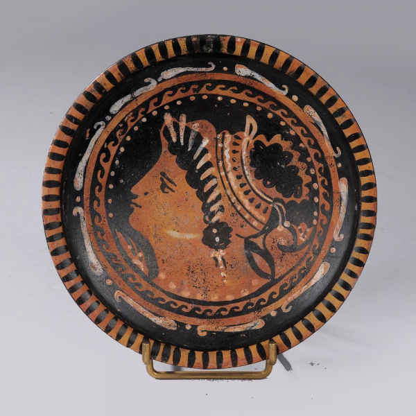 Plato sobre pedestal ligero decorado con un rostro de perfil rodeado de varios frisos. Diámetro 13 cm.