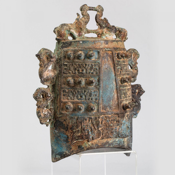 Excepcional Campana Imperial China Shang cilíndrica “Bo” de sección ovoide, con espiga zoomorfa con dos elefantes enfrentados y, a ambos lados de los bordes, dos pares de quimeras. A los lados, en cuatro registros, frisos y protuberancias clavadas que enmarcan dos cartelas caligráficas. Bronce con pátina de excavación. China. Zhou Occidental. 28 x 15 cm. Antigua colección francesa.
