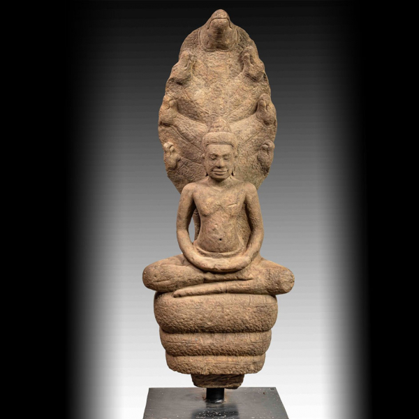 Buda Mucilinda sentado en meditación sobre el cuerpo del naga, desplegando su capucha septacéfala para protegerse de la inundación. Su rostro sereno, con una sonrisa típicamente jemer, expresa profunda meditación. Su peinado, una fina trenza rematada por la protuberancia craneal ushnisha. Arenisca beige. Camboya. La espalda del naga está finamente tallada con un chakra, símbolo de la ley budista, el atributo del disco del dios Visnú, siendo Buda el noveno avatar de Visnú. Camboya. Jemer. Yacimiento de Bayon. Siglo XIII. 1