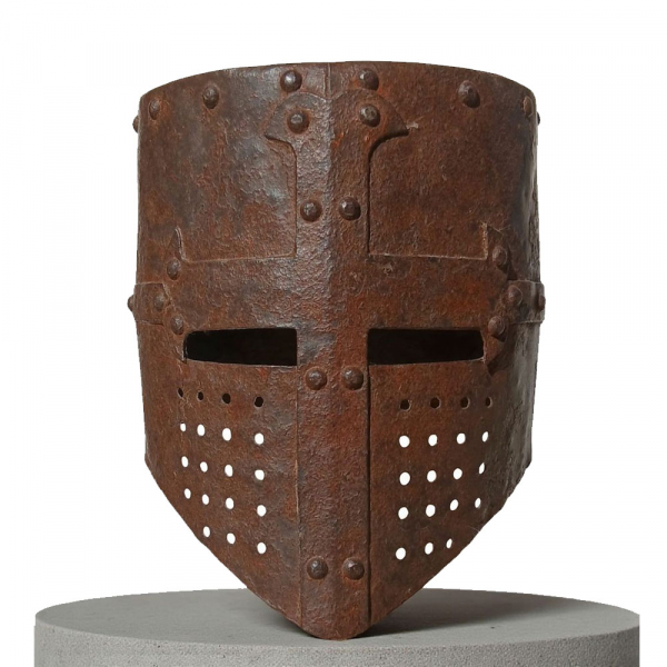 Yelmo de tipo pentolare, realizado en hierro forjado, compuesto por bandas unidas entre sí mediante clavos remachados. Presenta en el frente una cruz templaria florenzada aplicada, símbolo característico de la Orden del Temple. La pieza, se encuentra en un estado de conservación excepcional, constituyendo un notable testimonio de la armadura medieval europea y de la estética templaria de la época. Lote en almacén internacional (dentro de la UE).
