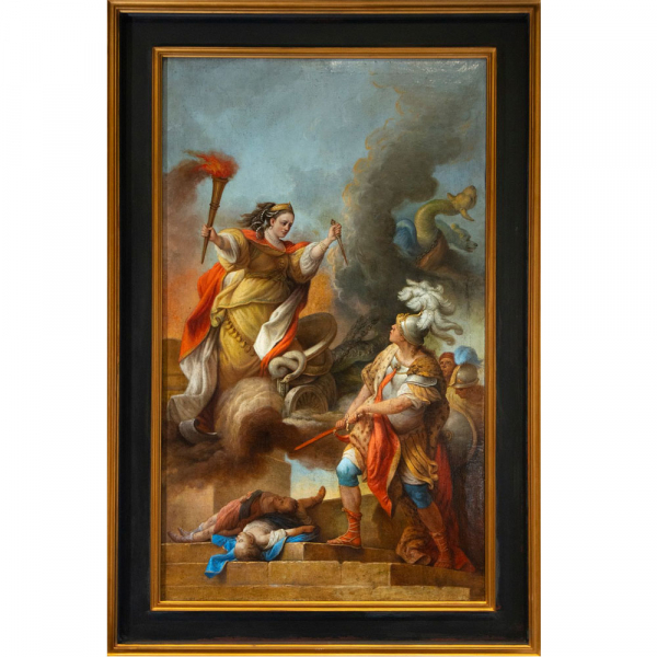 Lote destacado – Óleo sobre lienzo. Medidas: 155 x 94 – 182 x 22 cm. En esta compleja composición alegórica, una figura femenina alada —posiblemente la Virtud o la Fama— desciende envuelta en nubes, portando antorcha y puñal, y se dirige con gesto enérgico a un guerrero de armadura clásica. Él, firme sobre una escalinata, la mira con reverencia mientras blande una vara o bastón de mando. A sus pies, cuerpos abatidos refuerzan el dramatismo narrativo, mientras que al fondo emerge un dragón envuelto en humo, símbolo del mal vencido. El empleo del escorzo, los ropajes ondulantes, el uso expresivo del color y la riqueza escenográfica responden al gusto barroco tardío italiano, con ecos del rococó en la viveza cromática y el dinamismo teatral. La pincelada, suelta pero precisa, conjuga virtuosismo técnico con expresividad emocional. El contexto simbólico remite a temas morales y políticos —el triunfo de la virtud sobre la barbarie— en una clave visual espectacular. La obra articula una sintaxis visual profundamente elaborada, integrando mitología, teatralidad y moralidad, en perfecta sintonía con los ideales ilustrados del Siglo XVIII. Se trata de una pintura de gran calidad que combina destreza compositiva y ambición intelectual.