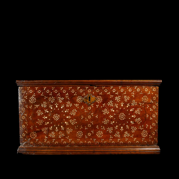 Madera con incrustaciones de hueso en forma de grano de arroz y marquetería en formas geométricas.