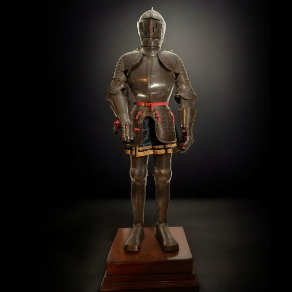 Una impresionante armadura renacentista de caballero del siglo XVI, destacada por su diseño y manufactura refinada. El conjunto está compuesto por una celada cerrada con visera articulada, peto decorado con rosetas y motivos geométricos grabados, y escarcelas en placas sobre faldilla de cota de malla. Las hombreras articuladas permiten movilidad sin comprometer la protección. Completa con manoplas a juego, esta armadura ha conservado sus elementos originales, algo inusual para una pieza de esta época, lo que la convierte en un ejemplo sobresaliente del arte de la armería renacentista. Su estado de conservación y la rica pátina sugieren un cuidadoso mantenimiento a lo largo de los siglos, mientras que los detalles decorativos grabados a mano resaltan el estatus del caballero que la portaba.
