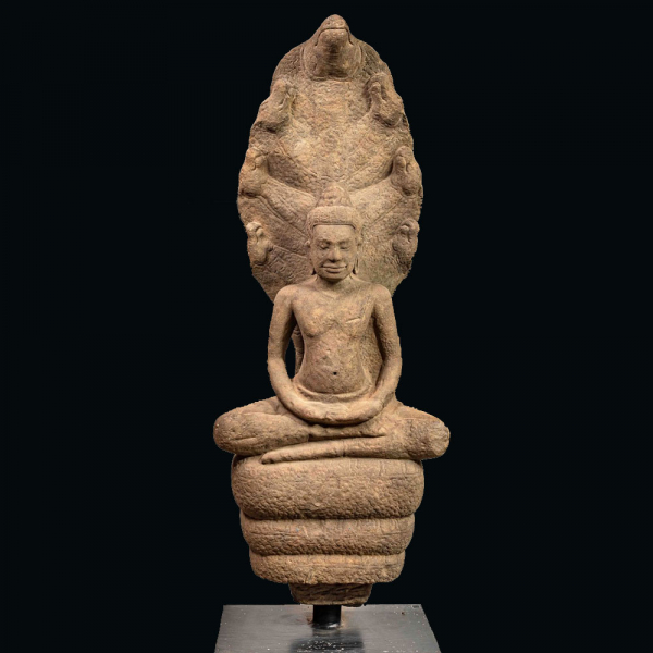 Monumental Grande Buda Mucilinda, sentado en meditación sobre el cuerpo del naga, desplegando su capucha septacéfala para protegerse de la inundación. Su rostro sereno, con una sonrisa típicamente jemer, expresa profunda meditación. Su peinado, una fina trenza rematada por la protuberancia craneal ushnisha. Arenisca beige. Camboya. La espalda del naga está finamente tallada con un chakra, símbolo de la ley budista, el atributo del disco del dios Visnú, siendo Buda el noveno avatar de Visnú. Camboya. Jemer. Yacimiento de Bayon. Siglo XIII. 110 x 22 x 45 cm. Lote en almacén internacional (fuera de la UE). Para envíos a la Unión Europea se aplicarán derechos y/o impuestos de importación a cargo del comprador.