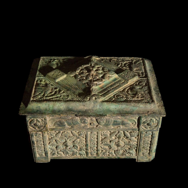 Contenedor de tapa piramidal con decoración geométrica y vegetal en altorrelieve, acompañado de escenas simbólicas en sus lados. La pátina verdosa y la superficie erosionada indican una considerable antigüedad. El tratamiento ornamental y el repertorio iconográfico sugieren una procedencia de tradición persa o de Asia Central. La pieza destaca por su riqueza decorativa y funcionalidad ritual o funeraria.
