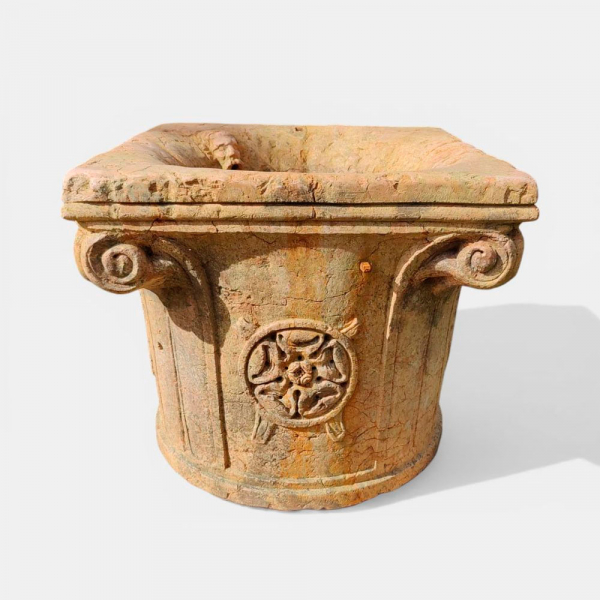 Medidas: 95 x 95 x 85 cm. Singular brocal de pozo de procedencia veneciana, realizado en mármol rojo de Verona y concebido como una pieza de notable presencia arquitectónica y decorativa. La obra presenta en dos de sus frentes sendos escudos heráldicos, uno de ellos especialmente interesante por su partición en cuatro cuarteles y por estar timbrado con corona nobiliaria, mientras que en los otros lados aparecen relieves de carácter pseudofloral que enriquecen el conjunto. Conserva además el gancho original y ofrece como detalle particularmente llamativo la presencia de una cabeza esculpida en uno de los ángulos interiores del pozo, elemento de gran fuerza expresiva que singulariza aún más la pieza. El mármol muestra una excepcional pátina, que acentúa su nobleza material y su atractivo ornamental. Se trata de una obra poco común, de proporciones equilibradas, apta tanto para espacios interiores como exteriores, que reúne valor decorativo, heráldico y arquitectónico. Se presenta en muy buen estado de conservación, íntegra. Lote en almacén internacional (dentro de la UE). Envío intracomunitario: no se aplican aranceles de importación dentro de la UE. Puede requerirse permiso de exportación del país de origen.