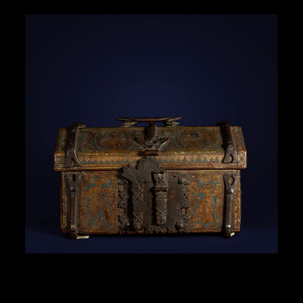 Importante Cofre colonial Mexicano del siglo XVII en cuero dorado y repujado del siglo XVII, con motivos de animales y Hernán Cortés.