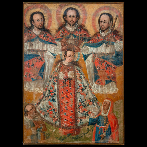Exquisita Coronación de María ante San Joaquín y Santa Ana - ESCUELA COLONIAL DE CUZCO , PERÚ VIRREINAL SIGLO XVII.