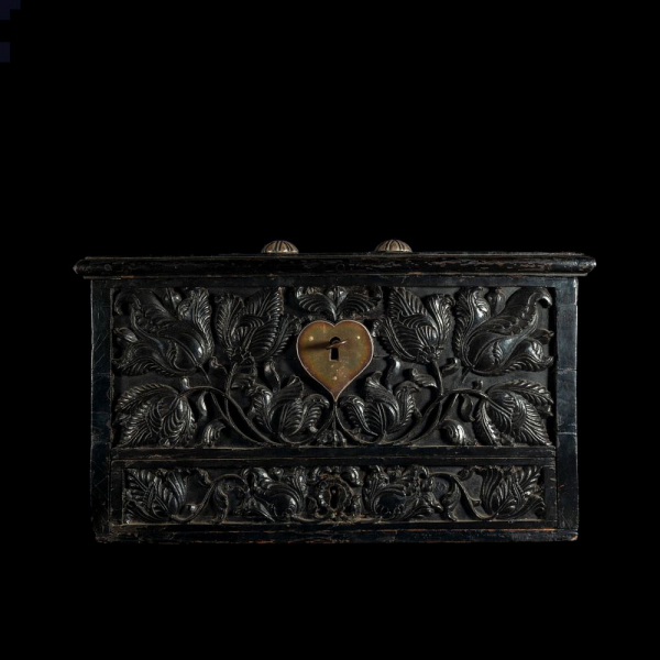 Realizado con finos motivos de flores tropicales labrados en madera ebonizada, cierre en plata fina en forma de Corazón al estilo “William and Mary” y asas también en plata. Medidas: 46 x 33 x 30 cm. Procedencia: anteriormente formando parte de una colección particular francesa.