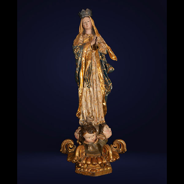 Gran talla en madera dorada y policromada, buen estado en dorados y policromía: 82 x 32 cm x 33 cm. Círculo del imaginero quiteño Bernardo de Legarda, escultor y pintor, sobresale como uno de os artistas más polifacéticos del Ecuador virreinal. Se le considera el mayor representante de las obras de de la escuela quiteña. Bibliografía: «La construcción del Quito patrimonial». Historia de Quito: patrimonio cultural de la humanidad. Vol. II. Quito: Corporación Editora Nacional. p. 24. ISBN 9789942321251. «En el retablo mayor se insertó un nicho para albergar a la Virgen de Quito de Legarda, fechada y firmada en 1734.»