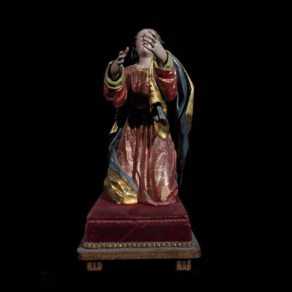 Conservando toda su policromía y dorados originales, en madera, medidas: 31 x 22 x 17 sin peana y con peana 38 x 28 x 20 cm. Lote no sujeto a reserva. Forma conjunto con el San Juan (lote 252 ) y la Dolorosa del lote 254 (posiblemente fueran ambas parte de un Calvario Novohispano). Procedencia: importante colección particular andaluza, palacete sevillano, Sevilla, Andalucía, España.