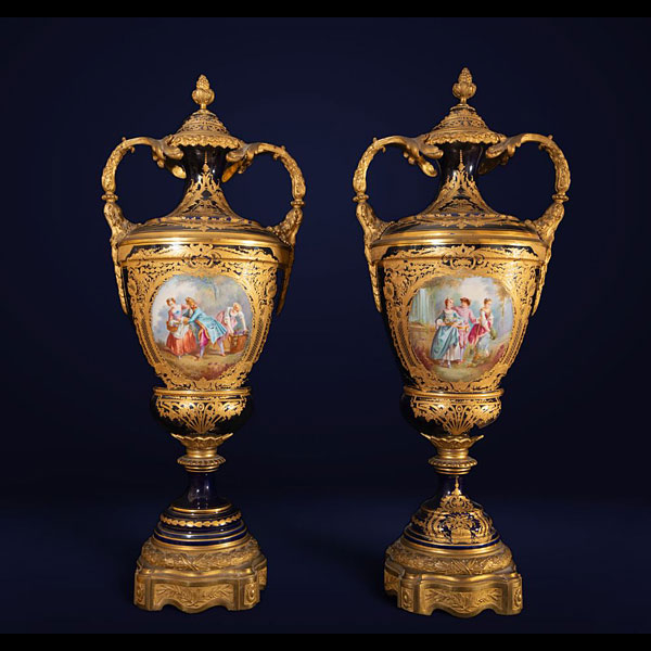 Pareja de Monumentales Jarrones de Sèvres del siglo XVIII, dedicados por el Marqués de Argens a la Marquesa de Villette en 1777.
