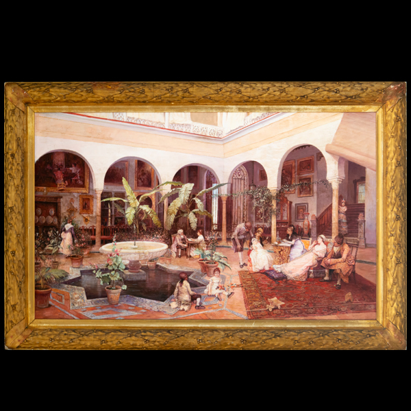Jiménez Aranda (Sevilla, 7 de febrero de 1837-Sevilla, 6 de mayo de 1903) , firmado, Interior de patio con personajes, escuela sevillana, siglo XIX.