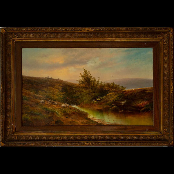 Óleo sobre lienzo. Medidas sin marco: 127 x 77. Medidas enmarcado: 164 x 113. Vistas de paisaje con prados y un río. Sobre el puente del río, un pastor, y ovejas pasturando en la hierba. Firmado. Carlos de Haes (Bruselas, 1826 – Madrid, 1898), pintor español de origen belga, es uno de los más destacados paisajistas del siglo XIX. Ganador en 1857 de la Cátedra de Paisaje en la Escuela Superior de la Academia de Bellas Artes de San Fernando, y galardonado con diversas medallas en los años posteriores, consiguió revalorizar el género de los paisajes en España. Abogó por estudiar con detenimiento la naturaleza con largas excursiones al aire libre para tomar bocetos y apuntes, dando a sus pinturas una perspectiva mucho más realista de lo que lo hicieron sus predecesores.