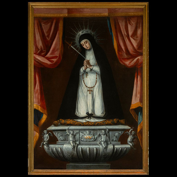 Una representación solemne de Santa Rosa de Lima, realizada en óleo sobre lienzo, propia de la Escuela Peruana del siglo XVIII. La santa, vestida con un hábito negro y blanco, está en oración con un crucifijo en sus manos. La composición destaca por el uso de colores oscuros en el fondo, que contrastan con la claridad de la figura central, realzando su santidad y devoción. 174×120 cm.