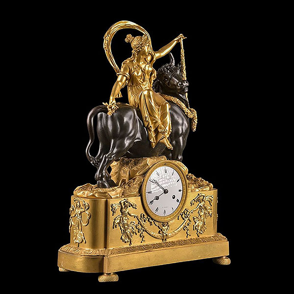 Reloj de bronce dorado con pátina oscura. Dimensiones: 58 x 47 cm. La esfera está firmada por D’Artois fils en París. El reloj muestra una de las escenas mitológicas más populares, "El rapto de Europa".
