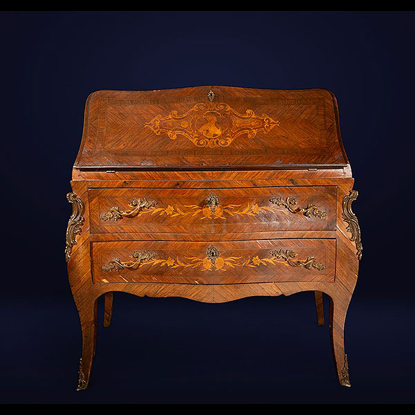 Dimensiones: 106 × 102 × 48 cm. Madera de nogal con manerales de bronce. Secreter estilo Regencia del siglo XVIII, adornado con marquetería floral y vegetal de gran detalle. La tapa abatible revela compartimentos secretos y una disposición interior destinada al almacenamiento de documentos. El contraste entre el nogal y los detalles en bronce realza la nobleza del mueble, que exhibe un equilibrio entre funcionalidad y belleza ornamental. El estilo Regencia, con su sobriedad decorativa y líneas elegantes, se aprecia en cada detalle de esta obra maestra de ebanistería europea.