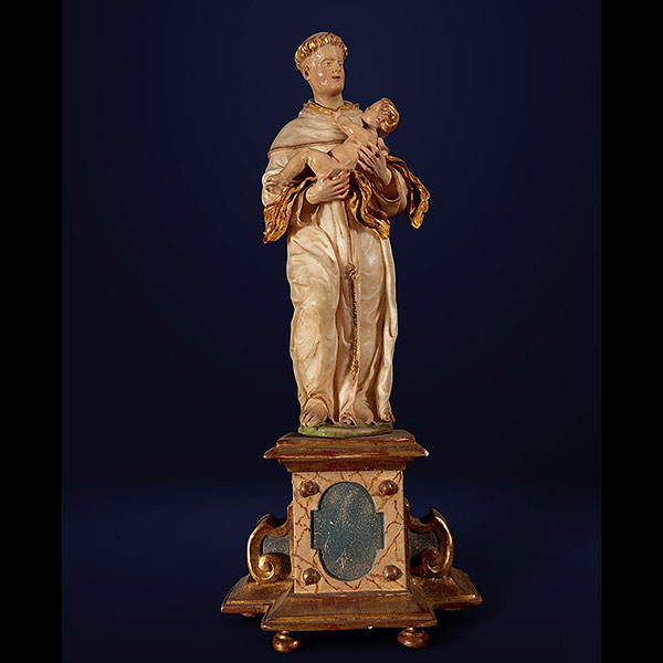 Mármol policromado. Dimensiones 54 × 24 × 13 cm. La escultura de mármol muestra a San Antonio sosteniendo tiernamente al Niño Jesús, quien descansa en sus brazos con una expresión serena. Los detalles finos en los pliegues de la vestimenta y la suavidad de las expresiones faciales son testimonio de la maestría escultórica napolitana. Durante el siglo XVII, este tipo de representaciones fue popular, sobre todo en Nápoles, por su realismo y devoción.