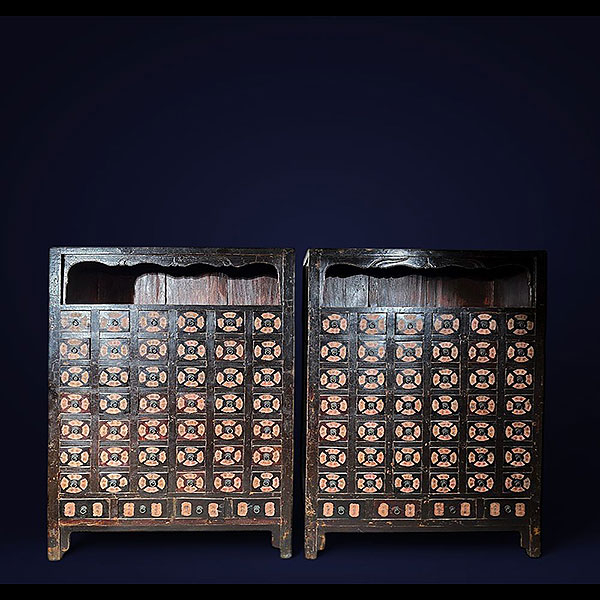 Dimensiones: 113 x 48 x 89 cm. Este hermoso gabinete de boticario es una pieza excepcional, con cuarenta y dos pequeños cajones divididos en cuatro secciones cada uno, diseñados originalmente para almacenar diferentes hierbas y remedios de la medicina tradicional china. Los cajones conservan sus etiquetas originales, que indican el contenido de cada sección, y en la parte inferior cuenta con tres cajones más amplios que probablemente albergaban instrumentos de boticario. Fabricado en olmo y con su acabado original en laca oscura en excelente estado, este gabinete se ha convertido en una pieza decorativa única y cada vez más rara para el hogar moderno.