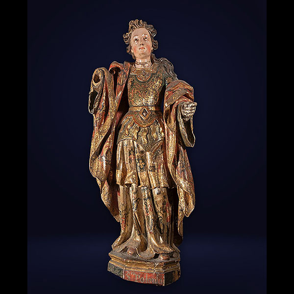 Dimensiones 83 × 36 × 25 cm. Santa Inés se presenta con su cordero a los pies, su vestimenta ricamente decorada con detalles dorados y policromía en tonos suaves. Su mano derecha sostiene un libro, símbolo de su conocimiento y su fidelidad cristiana. La elegancia manierista de la figura, con su alargada postura, refleja el estilo propio de la imaginería sevillana del siglo XVI, en la que el arte sacro buscaba realzar la devoción a través de una belleza idealizada.