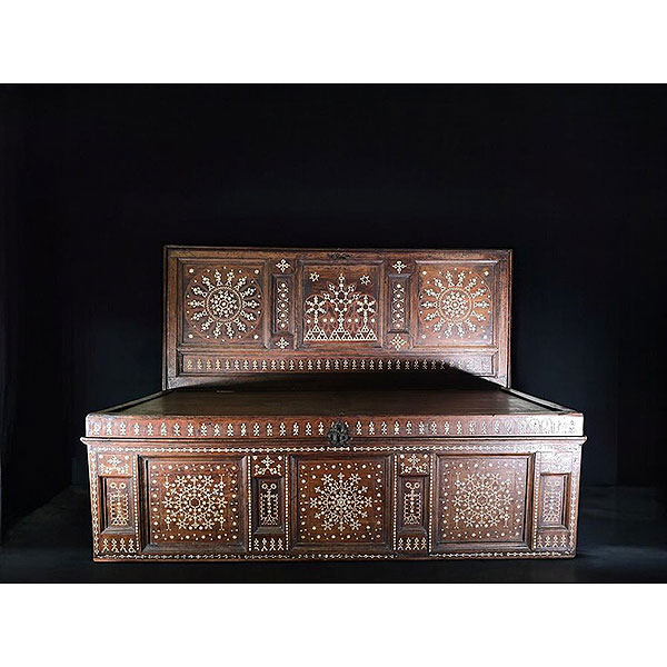 Madera tallada y marqueteria en hueso. Medidas: 43 x 50 x 132 cm.