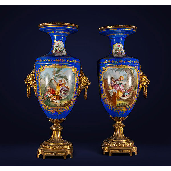 Medidas cada uno: 79 x 36 x 27 cm. Estos jarrones de porcelana de Sèvres del siglo XIX son ejemplos magníficos de la cerámica decorativa francesa. Decorados con escenas bucólicas pintadas a mano, estos jarrones muestran una maestría en la técnica del esmalte y el uso de colores vibrantes. Los detalles dorados y las asas ornamentales añaden un toque de opulencia. La porcelana de Sèvres es renombrada por su alta calidad y delicadeza, característica de la escuela francesa de ese siglo.