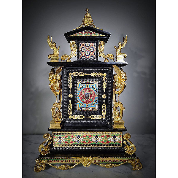 TABERNÁCULO ITALIANO DEL ÚLTIMO CUARTO DEL SIGLO XVII REALIZADO EN MERCURIO y BRONCE DORADO, PLATA, ESMALTE Y ÉBANO – ESTE ESPECTACULAR TABERNÁCULO POR SU CALIDAD Y RAREZA ES UNA PIEZA DE MUSEO.TIENE UN PULSADOR LATERAL QUE ABRE LA PUERTA AUTOMATICAMENTE MEDIANTE UNRESORTE AL PRESIONARLO, EN EL INTERIOR SE MUESTRA AL FONDO LA IMAGEN DE LAVIRGEN MARÍA CON EL NIÑO JESÚS. EN LA PARTE SUPERIOR ENCONTRAMOS EL MONOGRAMA DEL AVE MARIA Y DOS ÁNGELES ORANDODE RODILLASEN LA PUERTA EXISTE UN ESCUDO DE PLATA GRABADO CON LAS INICIALES: A.M. QUECORRESPONDE A LA PERSONA QUE LO ORDENÓ (DESCONOCIDO) EN EL COMPLEJO SEENCUENTRA EN EXCELENTE ESTADO DE CONSERVACIÓN SE PUEDEN ENCONTRAR PIEZAS SIMILARES: MUSEO MET, PALACIO PITTI y MUSEO DE LA CAPILLA DE DRESDE. MEDIDAS:38 X 23 X 12CM