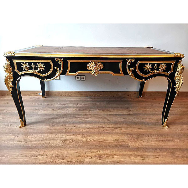Un escritorio en madera lacada en negro con decoración en bronce dorado. en un lado tres cajones siguiendo los movimientos del frente, finalmente en el lado opuesto tres falsos cajones. Toda la fachada está adornada con tiradores y bocallaves en bronce dorado. Dimensiones: Alto 80 cm – Largo 160 cm – Fondo 82 cm. Preciosa obra francesa del siglo XIX. Nuestro escritorio se presenta en perfecto estado de uso. Se encuentra en muy buen estado de conservación.