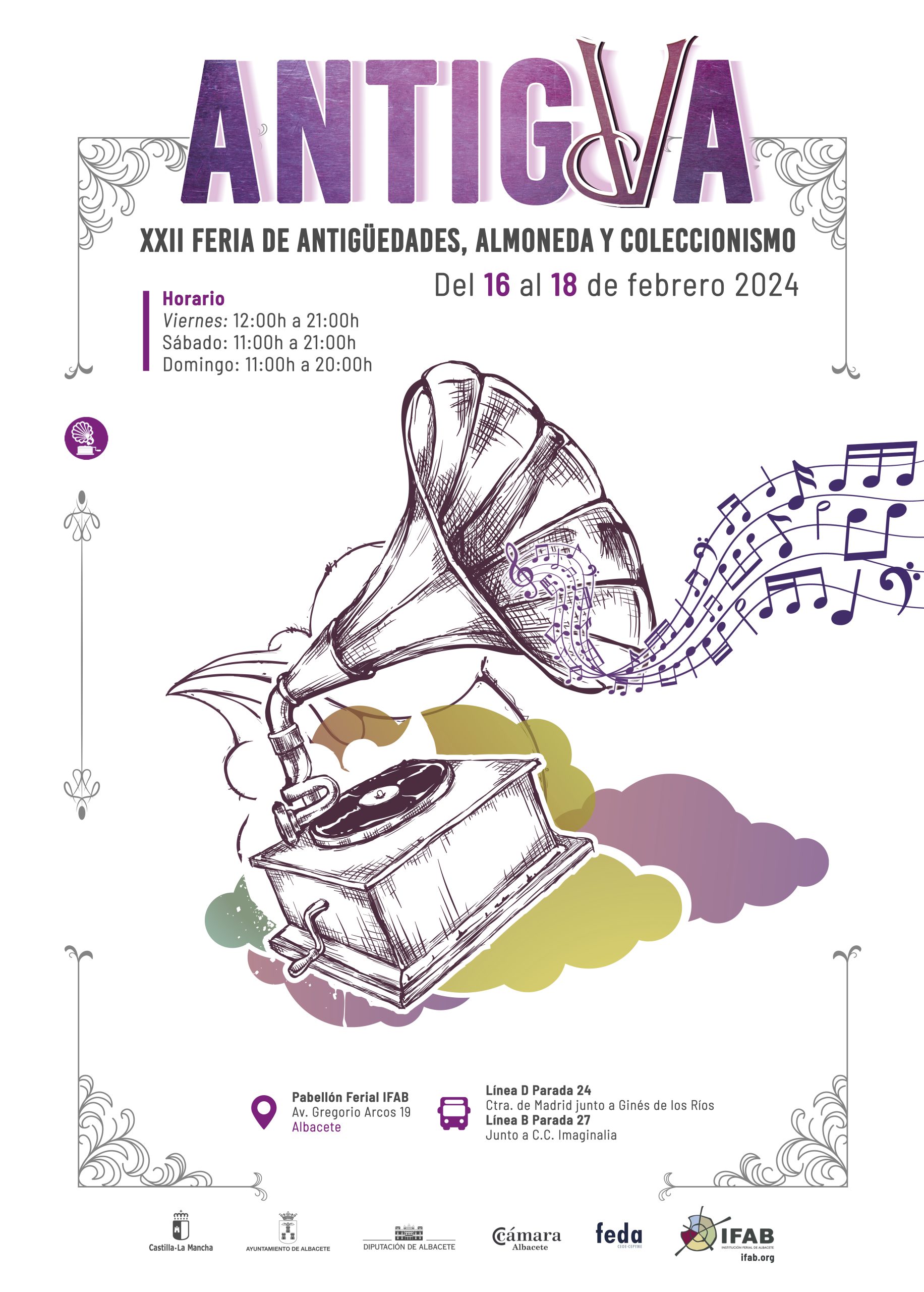 Como cada año, se celebra en el Pabellón Ferial IFAB de Albacete la Feria de Antigüedades ANTIGUA, que en esta ocasión se podrá visitar del viernes 16 al domingo 18 de febrero de 2024 en el siguiente horario: