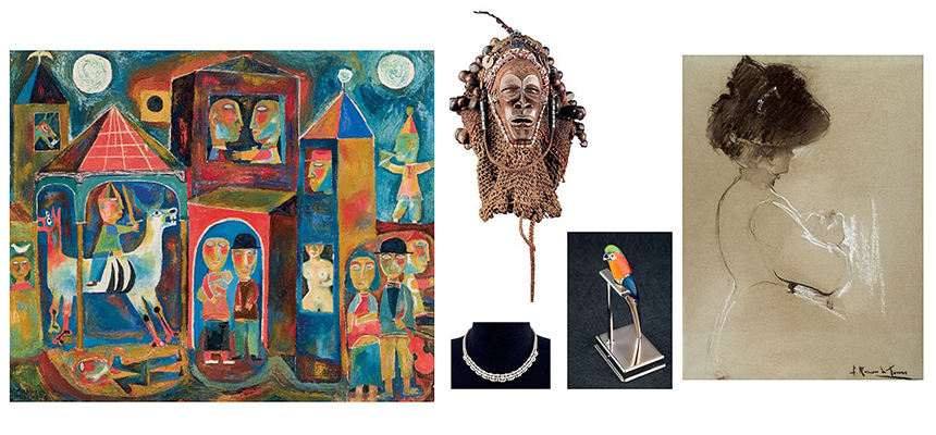 En la categoría de joyas destacamos un magnífico collar de oro blanco y diamantes [lote 0205], que saldrá a subasta por 20.000 € y un reloj de pulsera Patek Philippe, modelo calatrava, para caballero [lote 0190] con precio de salida de 9.000 €. Destacamos también la maravillosa estilográfica Lovebird de Cartier [lote 0182], realizada con forma de ave en plata y esmalte policromo, con un precio de salida de 10.000 €. Y en el apartado de arte tribal, destacamos la máscara Pwo [lote 0490] procedente de la República Democrática del Congo, realizada por la cultura Chokwe en el siglo XIX.