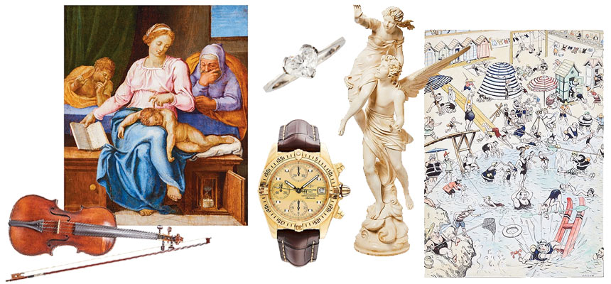 En el apartado de JOYAS Y RELOJES encontramos una exquisita Pulsera rivière en oro blanco con diamantes talla brillante engastados en chatón (salida 4.500 €); una Sortija en oro blanco con diamante talla corazón engastado en garras (salida 6.100 €); y una pareja de pendientes en oro blanco con rubíes talla redonda y perilla orlados por diamantes talla brillante (salida 1.900 €). A destacar también un Reloj Breitling "Chrono Cockpit" de pulsera para caballero, en oro y correa de piel (salida 7.800 €); y reloj Festina de pulsera para señora de oro, con esfera dorada con numeración a trazos aplicados (salida 3.500 €).