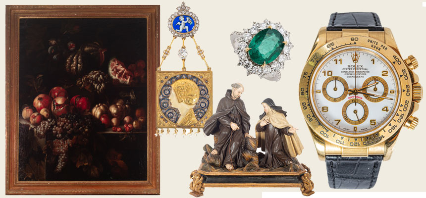 Dentro de esta subasta destacaremos las siguientes piezas: una obra atribuida a Giovanni Battista Ruoppolo (Nápoles, 1629-1693) "Bodegón de frutas", en óleo sobre lienzo (salida €18.000); de la Escuela napolitana de finales S. XVII "San Pedro de Alcántara confesando a Santa Teresa de Jesús", grupo en madera tallada, policromada y dorada (salida €15.000); un espectacular colgante Masriera Hermanos y Joaquín Carreras en oro, platino, esmalte, perlas cultivadas y diamantes, c.1918 (salida €15.000); una exquisita sortija rosetón en oro blanco con esmeralda de Zambia y diamantes (salida €8.200); y como lote estrella de la subasta, un excepcional y raro Rolex "Daytona", reloj de pulsera para caballero en oro 18K y correa de piel, c.1990, Ref. 16518 (salida €8.000).